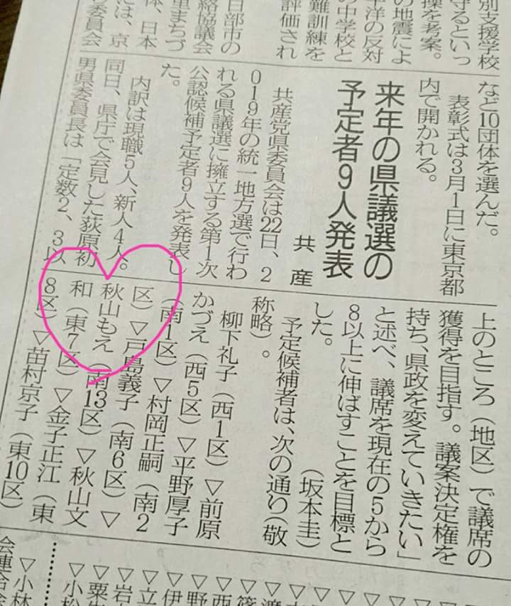 秋山もえ/ 上尾市議会議員3期目/ 家族は夫&こども3人/ 1976年2月11日に千葉県木更津市に生まれる/ Ally(性的マイノリティ支持)/ 手話を勉強中/ 自営パン屋を営む両親の手伝いをしながら育つ/ 小・中・高校と陸上競技、水泳、ロードレース、バスケットなどスポーツばかりの日々/ 身長170㎝/ 新聞奨学生として朝日新聞の配達・集金をしながら予備校2年間を足立区北千住&大学4年間を板橋区中板橋で過ごす/ 大学に在学中に日本共産党に入党/ ウルドゥー語(パキスタンの言語)を専攻/ 2000年3月大東文化大学国際関係学部卒業/ 2000年日本共産党埼玉県委員会勤務/ 2007年上尾市議会議員選挙に立候補・初当選/ 好きな食べ物は母がつくるすいとん、ひじき、豆腐、納豆、さつまいも、いちご、チョコレート/ お酒は梅酒を一杯くらいしか飲めない/ タバコは大嫌い/ 埼玉県上尾市西上尾第二団地2-19-503在住/ 048-783-0503/ 090-5394-7971/ mugendai2010@docomo.ne.jp