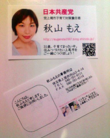 秋山もえ/ 上尾市議会議員3期目/ 家族は夫&こども3人/ 1976年2月11日に千葉県木更津市に生まれる/ Ally(性的マイノリティ支持)/ 手話を勉強中/ 自営パン屋を営む両親の手伝いをしながら育つ/ 小・中・高校と陸上競技、水泳、ロードレース、バスケットなどスポーツばかりの日々/ 身長170㎝/ 新聞奨学生として朝日新聞の配達・集金をしながら予備校2年間を足立区北千住&大学4年間を板橋区中板橋で過ごす/ 大学に在学中に日本共産党に入党/ ウルドゥー語(パキスタンの言語)を専攻/ 2000年3月大東文化大学国際関係学部卒業/ 2000年日本共産党埼玉県委員会勤務/ 2007年上尾市議会議員選挙に立候補・初当選/ 好きな食べ物は母がつくるすいとん、ひじき、豆腐、納豆、さつまいも、いちご、チョコレート/ お酒は梅酒を一杯くらいしか飲めない/ タバコは大嫌い/ 埼玉県上尾市西上尾第二団地2-19-503在住/ 048-783-0503/ 090-5394-7971/ mugendai2010@docomo.ne.jp